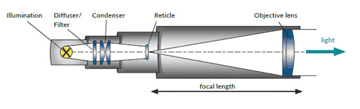 Die Strichplatte befindet sich in der Brennebene des Objektivs. Der austretende Strahl ist kollimiert, d. h. alle Strahlen, die von demselben Punkt auf der Strichplattenebene ausgehen, sind parallel zueinander. Das Bild der Strichplatte wird ins Unendliche projiziert, da sich parallele Strahlen in einer endlichen Entfernung nicht kreuzen.